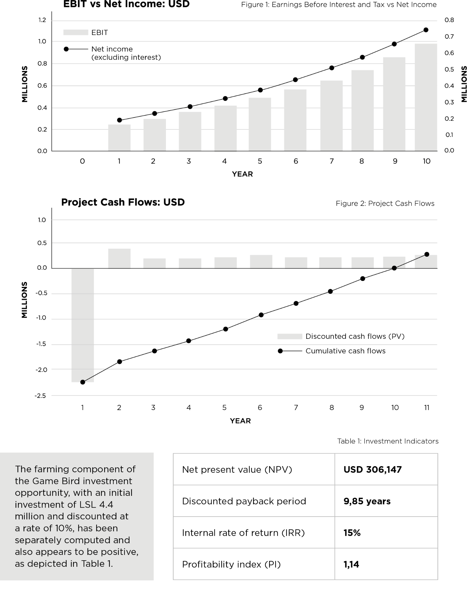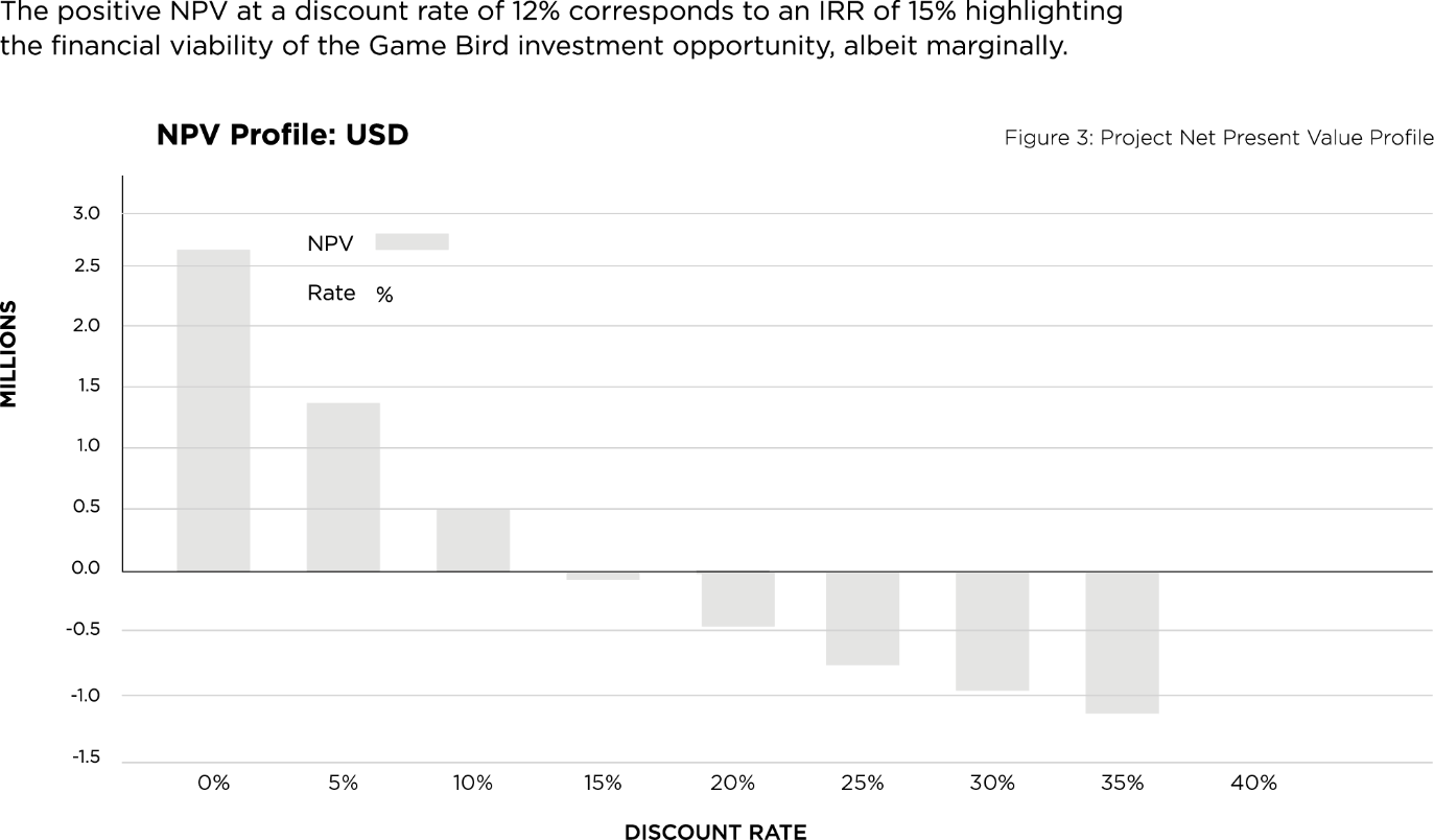 pre-production expenditure of USD 139k and initial working capital of approximately USD 305k will be required for the establishment of the Game Bird enterprise. The graphs below illustrate a financially viable operation with the opportunity expected to generate a profit throughout its operational life.
