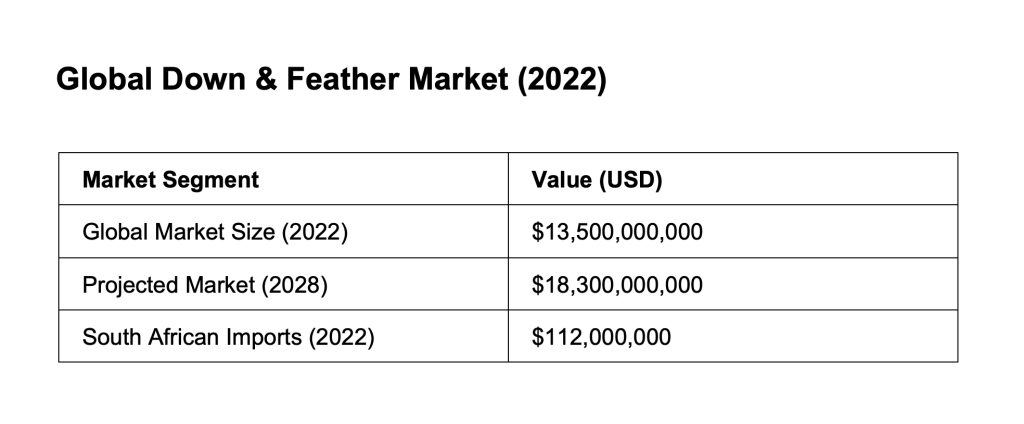 Import demand for game bird meat is strong and geographically spread, with the EU and UK constituting the largest bloc (~ USD 1.13bn), while the global down and feather market, projected to grow from USD 13.5 billion in 2022 to reach USD 18.3bn by 2028. The United States represents a further USD 108m market, with significant demand also in affluent Asian markets like Japan and Hong Kong.