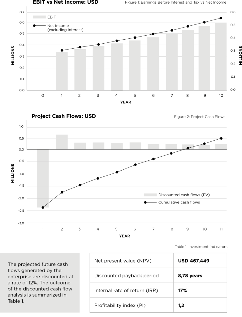 comprising fixed assets of almost USD 1.5m, pre-production expenditure of USD 389k and initial working capital of USD 500k will be required for the establishment of the Hemp production enterprise. The graphs below illustrate a financially viable operation with the opportunity expected to generate a