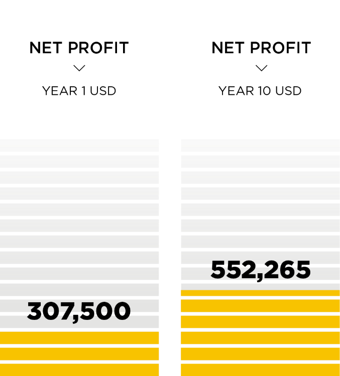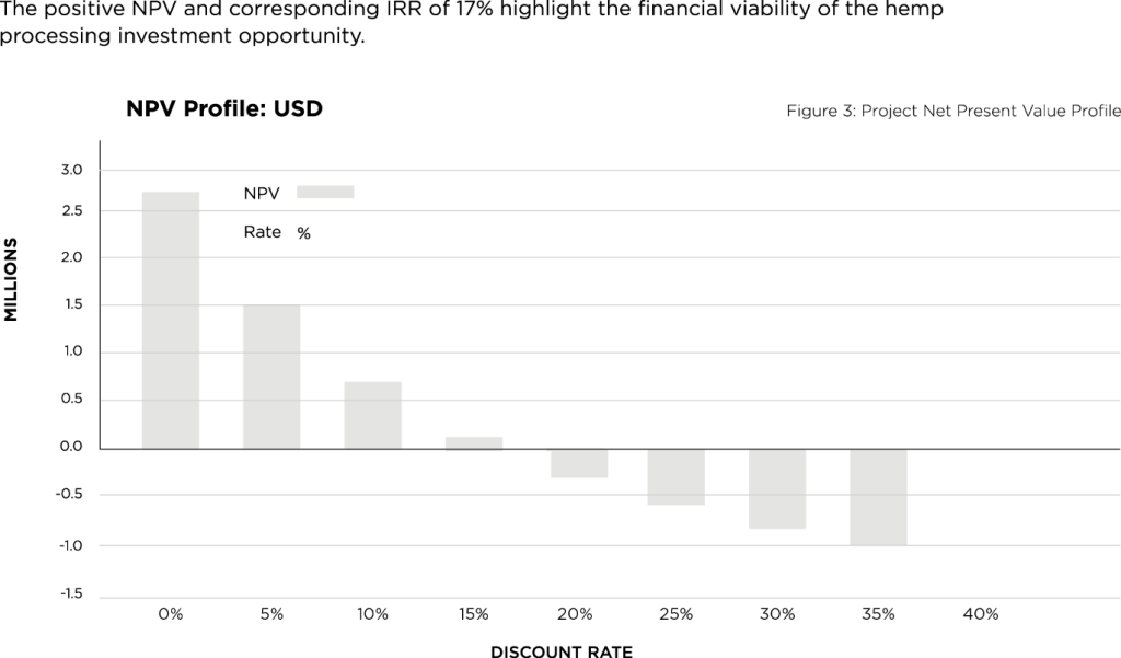 This is a mid-sized facility with an annual capacity of 500 tons, focused on industrial hemp processing into fiber decortication for textiles and building materials as well seed and grain for animal feed. The financial analysis of the Hemp investment opportunity is computed over a ten-year period. Revenue and expenditure projections are in line with industry growth prospects and market potential and have been informed by and benchmarked against industry standards and norms. In addition, assumptions relating to inflation; depreciation and salvage value; and company tax, have been worked out based on the existing laws and directives of the country. The figures above represent high level estimates as of October 2025 and are not derived from a full feasibility study. Investors are advised to conduct their own due diligence.