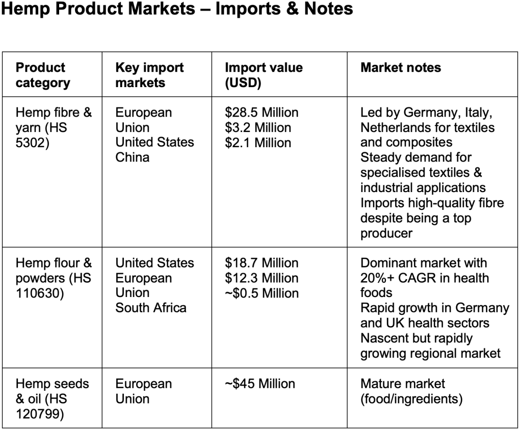 Global import demand for hemp products (selected HS lines) – (ITC Trade Map/UN Comtrade, 2023)