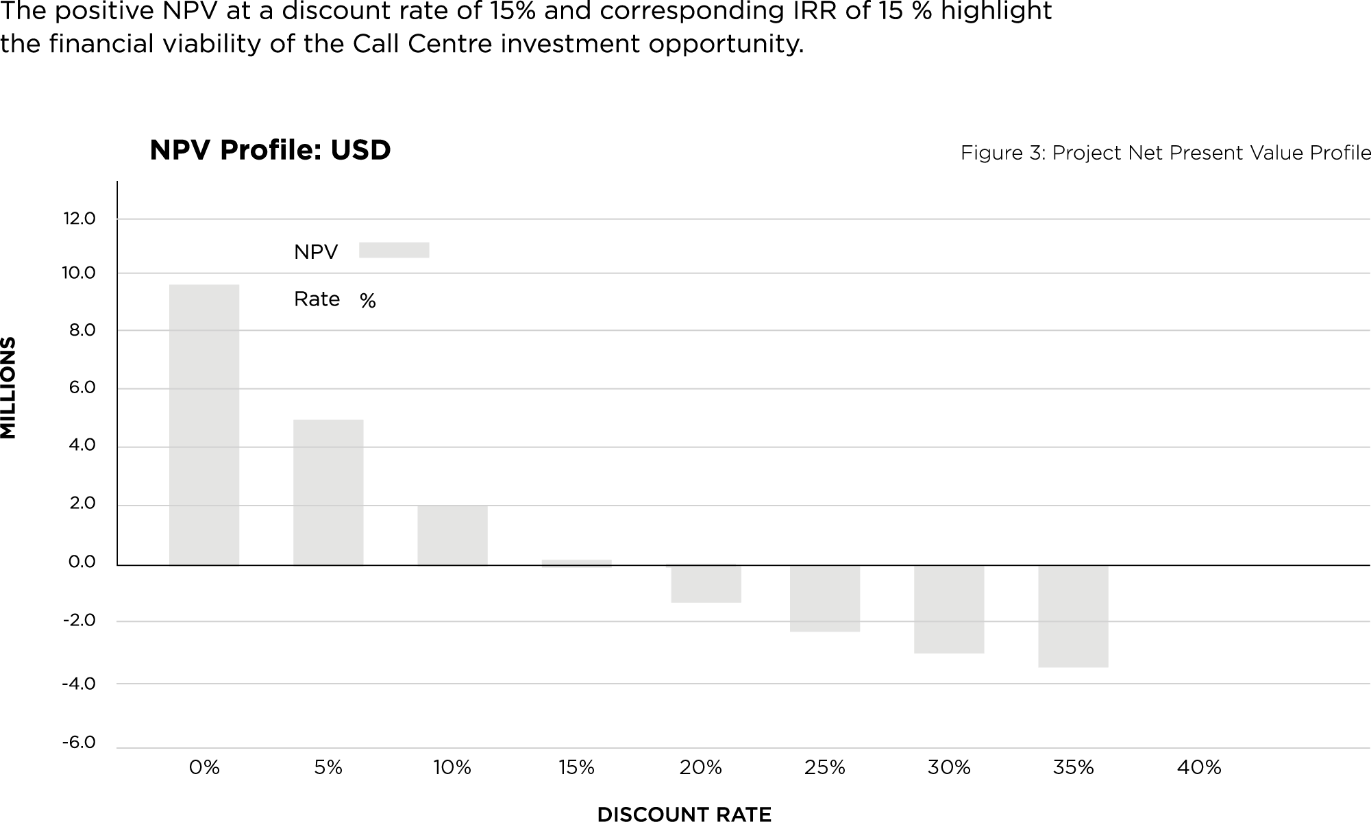 comprising of fixed assets of USD 4.45m, pre-operation expenditure of USD 976k and initial working capital of USD 150k will be required for the establishment of the Call Centre opportunity. The graphs below illustrate a financially viable operation with the opportunity expected to generate a profit throughout its operational life.