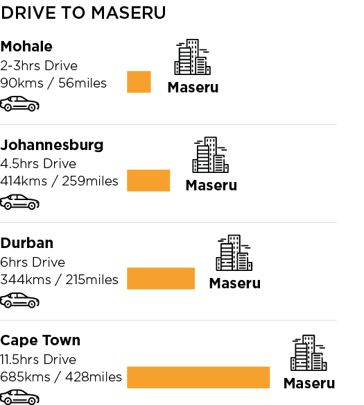 Lesotho’s membership of SADC also improves opportunities for training. The SADC Protocol on the Development of Tourism provides for harmonisation of tourism services and standards. Maseru is the main gateway to Lesotho, 2-3 hours’ drive from Mohale. Moshoeshoe I International Airport in Maseru is served by direct flights to and from Johannesburg, a major international hub. Maseru is 414 kms (4.5 hours’ drive) by road from Johannesburg, 344 kms (6 hours) from Durban and 685 kms (11.5 hours) from Cape Town.